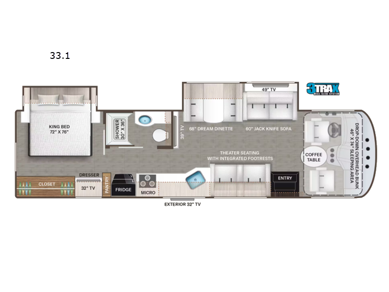 This coach will feel more like home with its spacious living area thanks to the large slide out. Here, you can relax on the jack-knife sofa or play a game at the Dream Dinette. You may just want to kick your feet up on the theater seating with integrated footrests across from the 49" LED TV. There is even a second living room TV that is in great view from the drop-down overhead bunk! Whip up your best meals on the three burner gas cooktop, or use the convenient microwave oven. You'll appreciate plenty of counter space, a pantry to store snacks, and a double door refrigerator for perishables. You can keep your clothes tidy in the large bedroom closet, and the full bath is sure to be convenient while you're away from home!